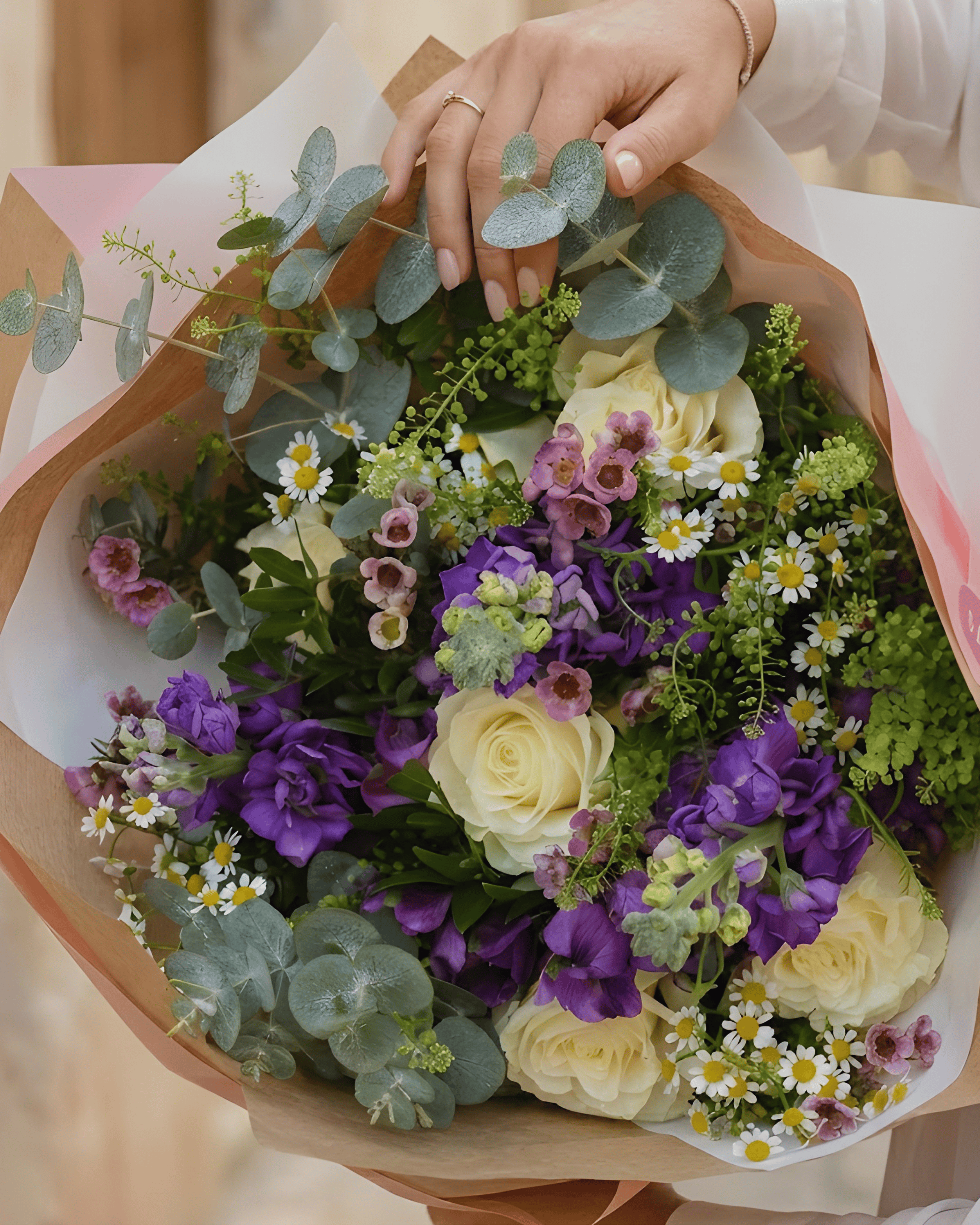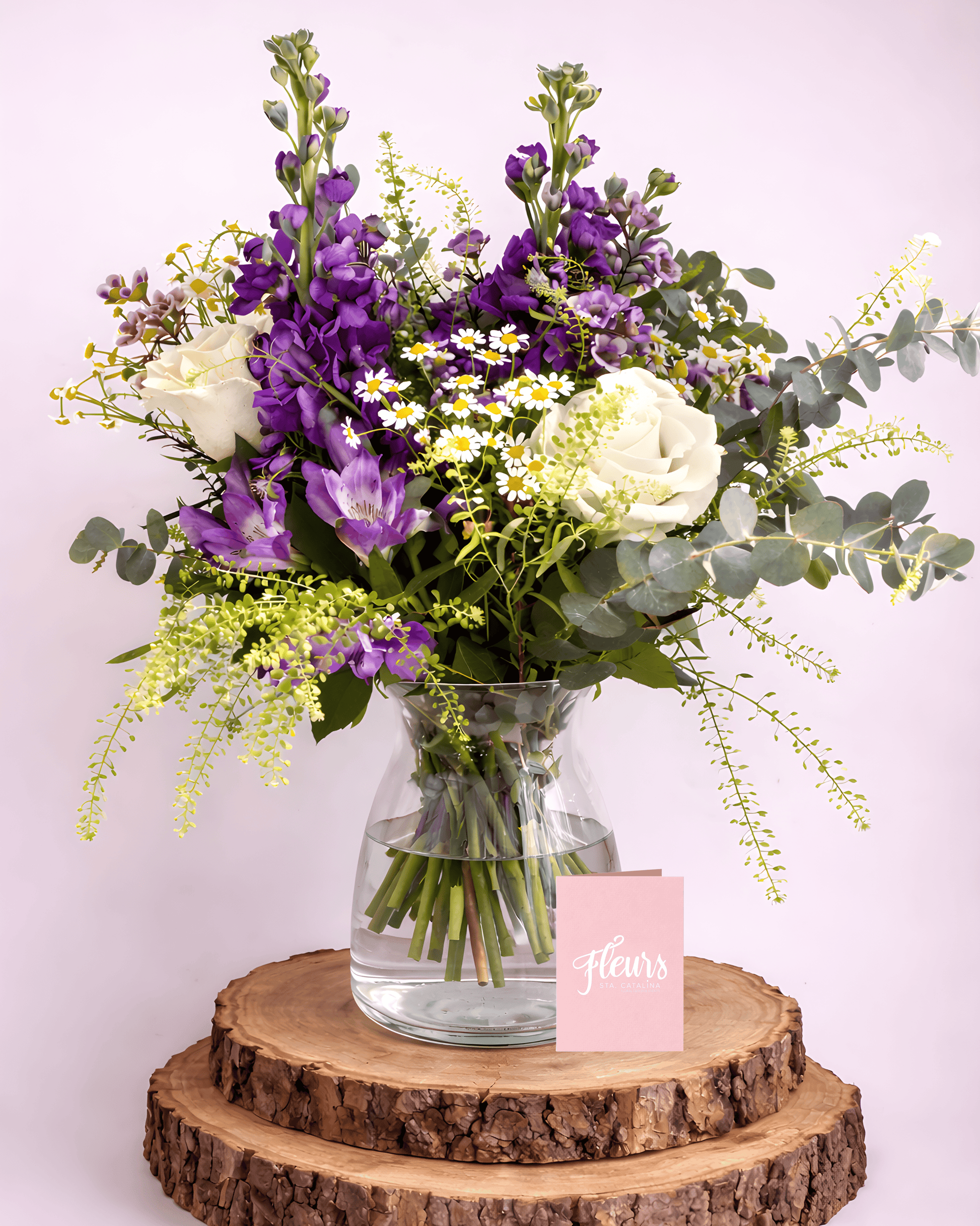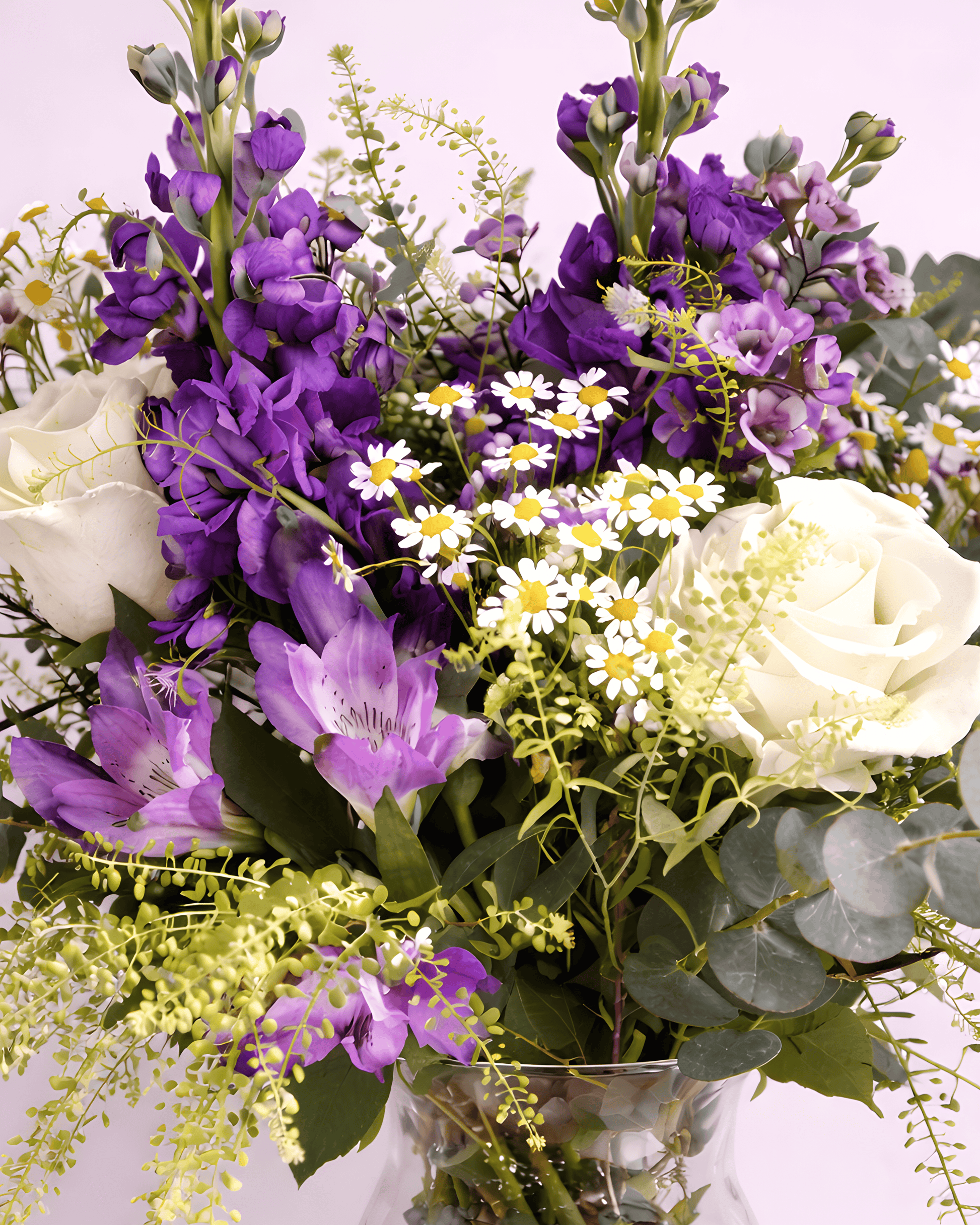 Una composición sofisticada que combina flores moradas vibrantes , margaritas blancas delicadas , rosas cremosas y eucalipto fresco , presentada en un elegante jarrón de cristal . Un arreglo equilibrado, luminoso y lleno de intención, diseñado para transmitir admiración, cariño y respeto.