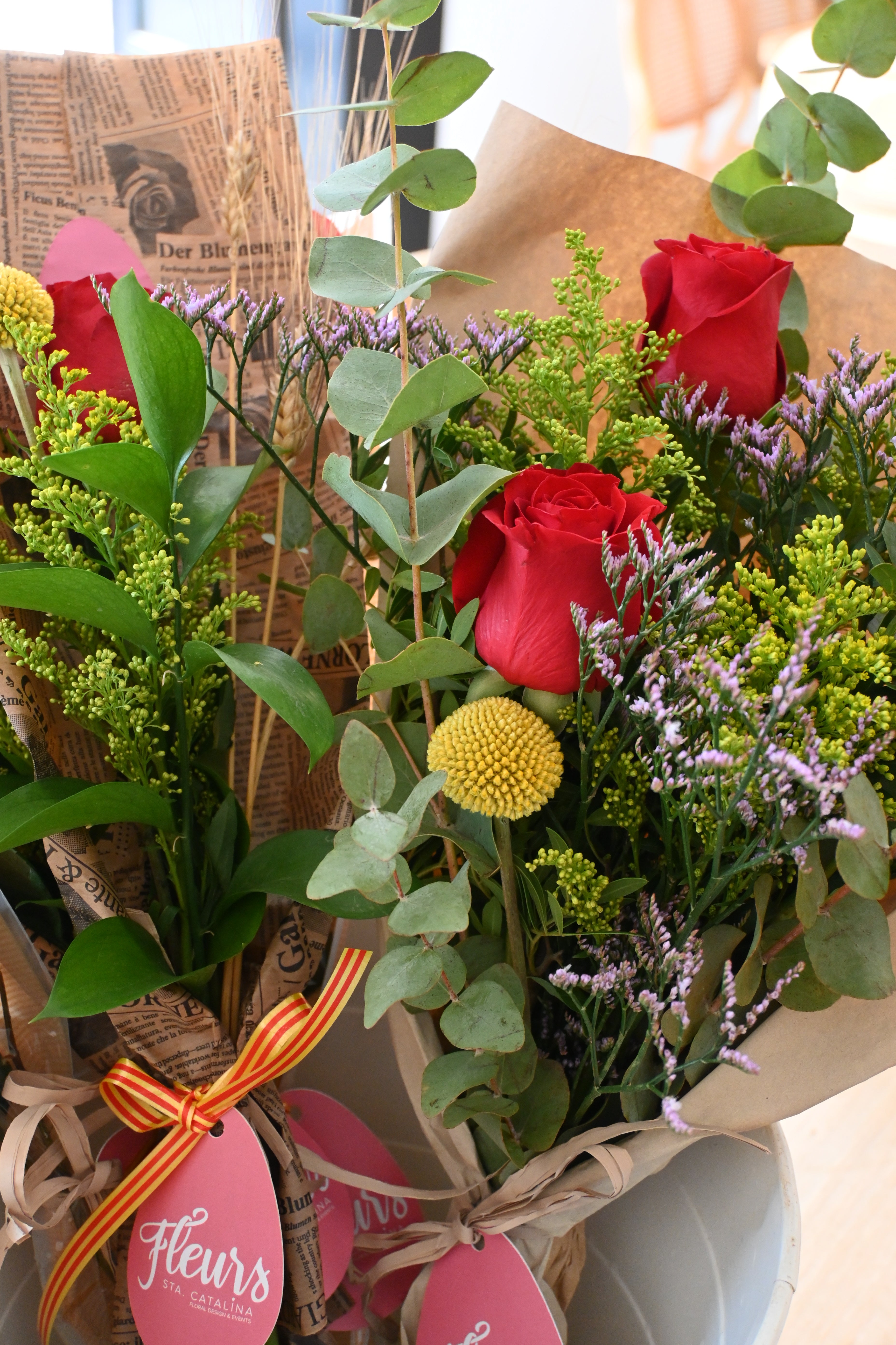 Un ramo de tres rosas rojas acompañado de verdes naturales, espiga, craspedia y flores de temporada en tonos silvestres.